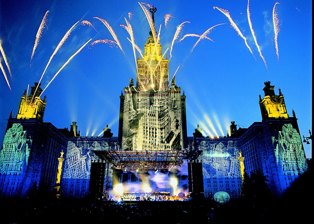 Evento: 850 Aniversario de Moscú, que se llevó a cabo frente a la Universidad Estatal de Moscú.